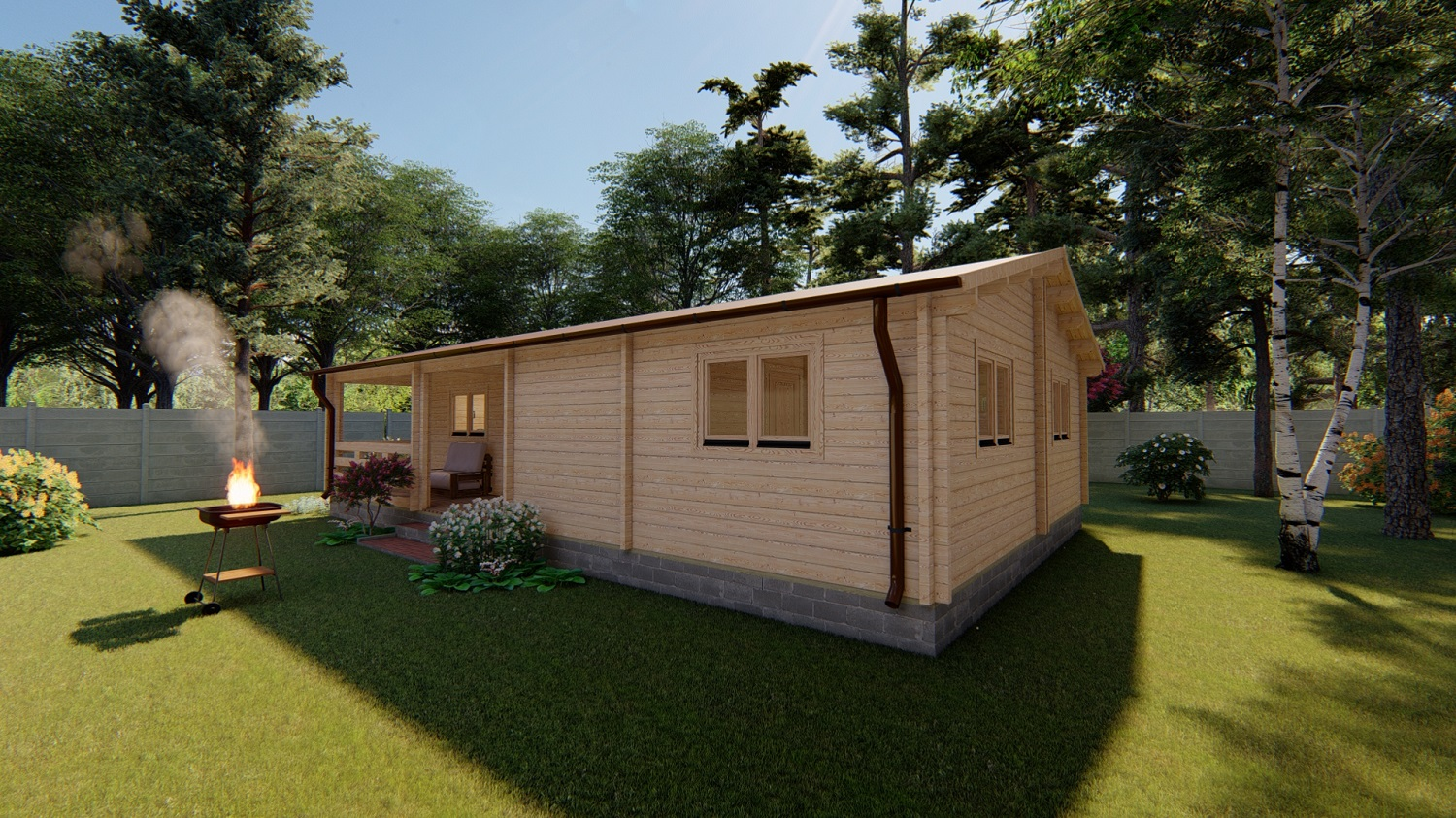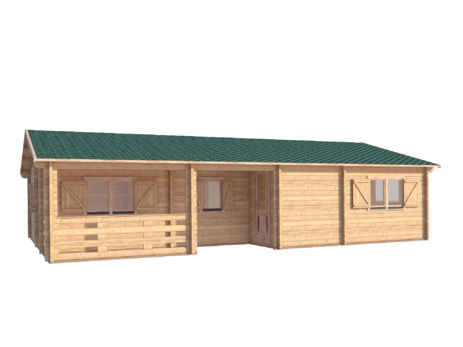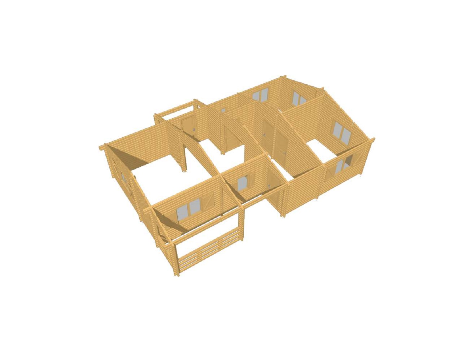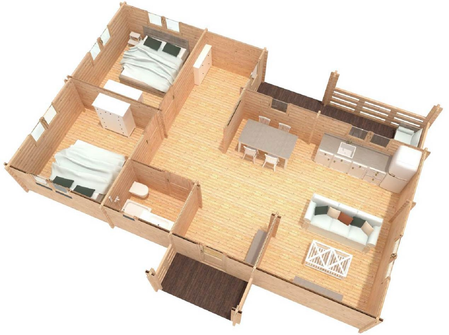 Uma casa de madeira com dois quartos, banheiro e sala/cozinha. Com uma área de 78 m², esta é uma casa de madeira de verdade! É uma casa confortável e espaçosa, com um terraço. Este chalé permitirá que você aproveite o ar fresco enquanto se protege do sol e da chuva. Claro, o chalé Markus também é muito sólido, graças à sua estrutura de madeira de abeto.