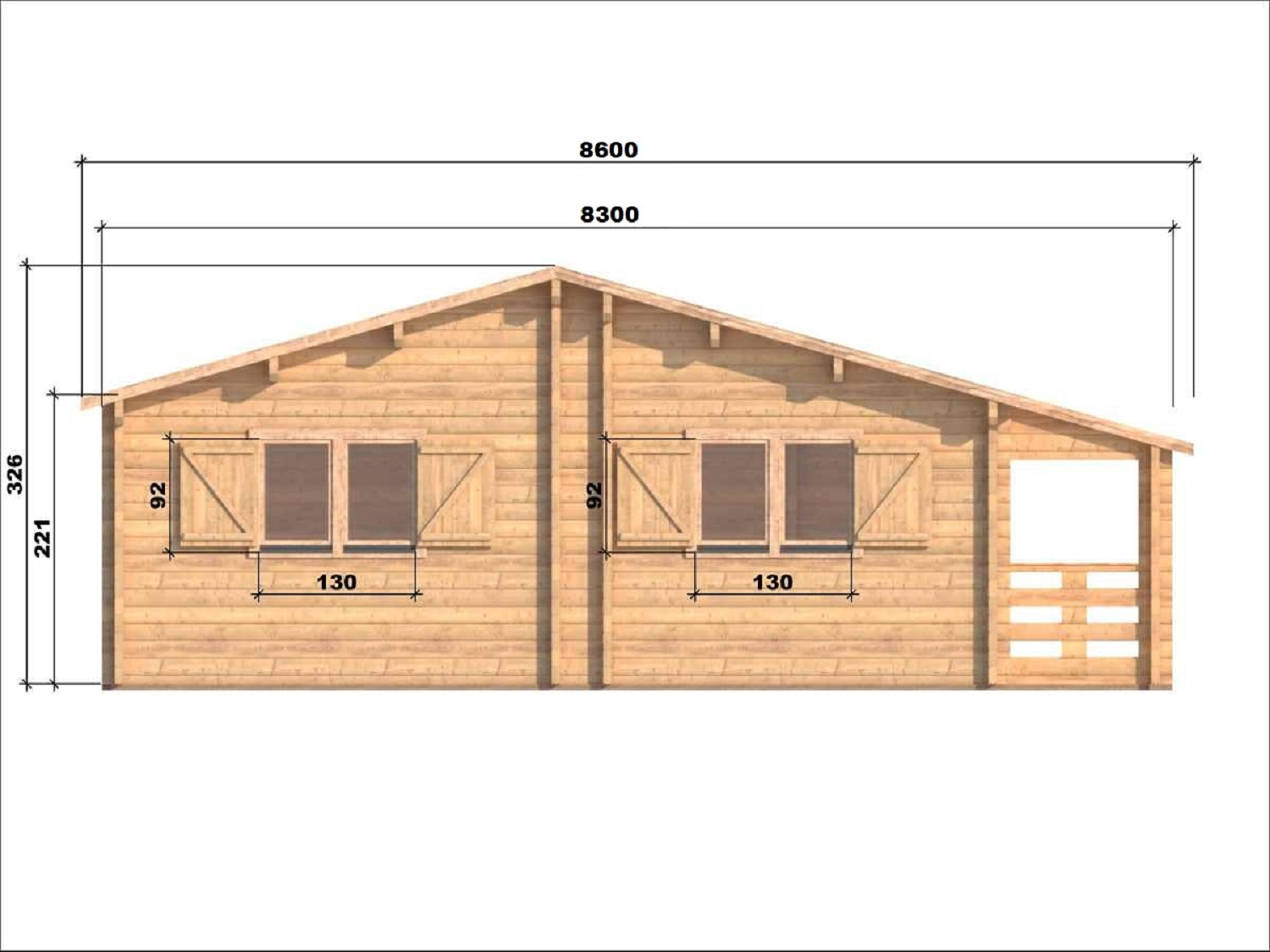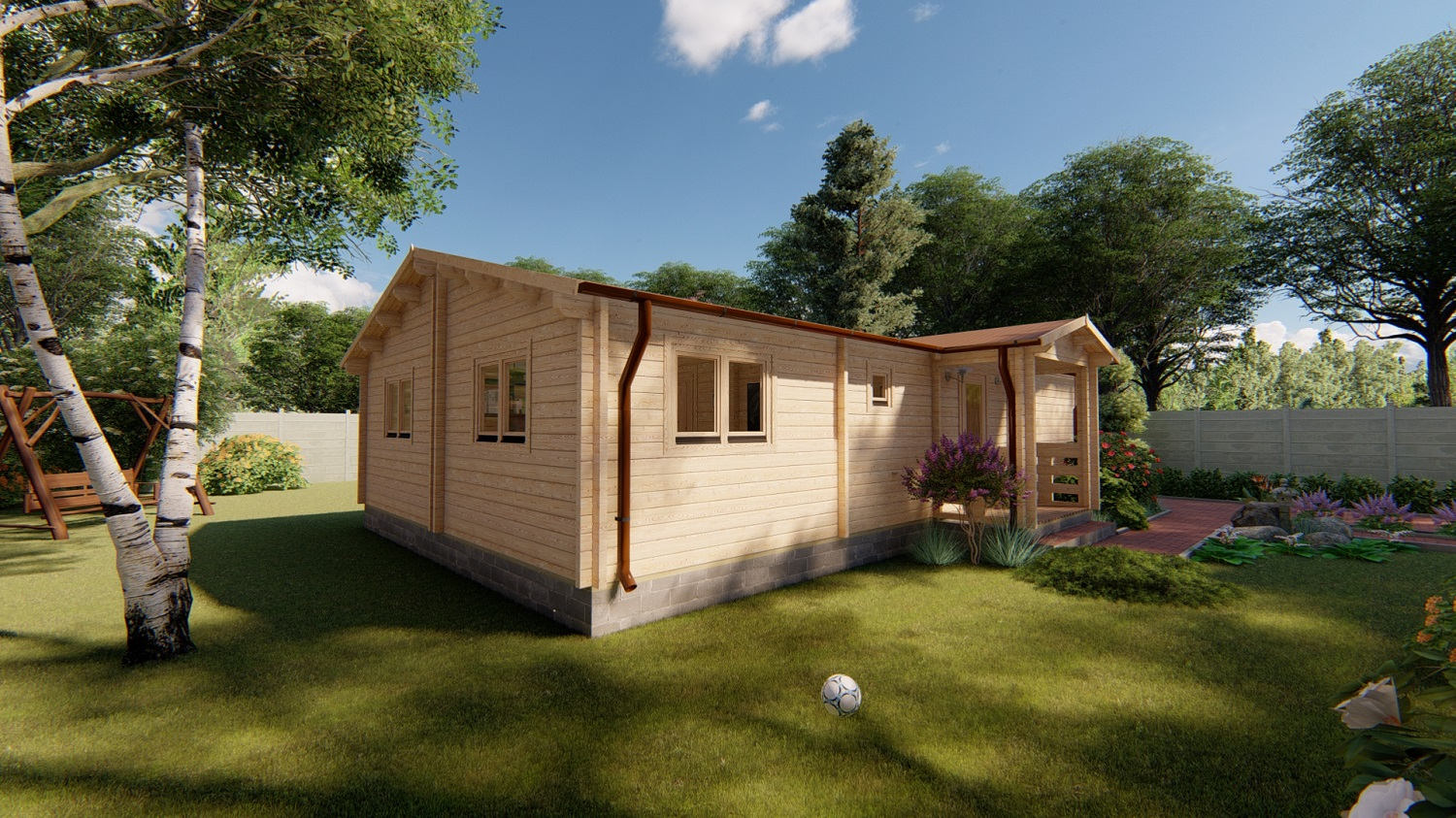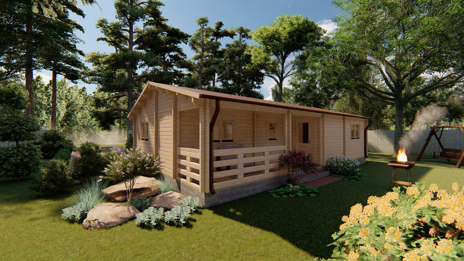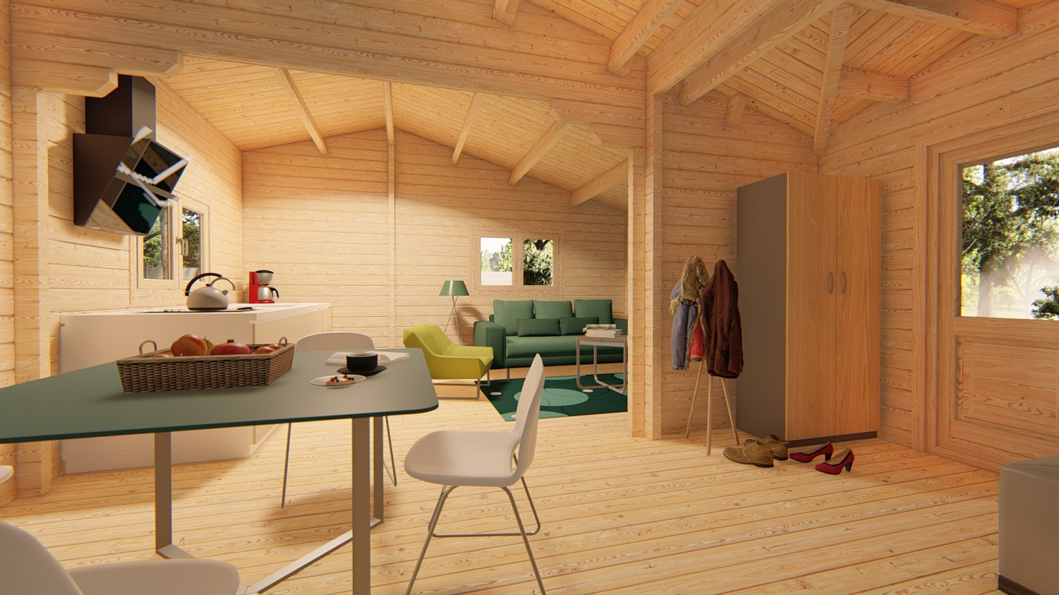 Uma casa de madeira com dois quartos, banheiro e sala/cozinha. Com uma área de 78 m², esta é uma casa de madeira de verdade! É uma casa confortável e espaçosa, com um terraço. Este chalé permitirá que você aproveite o ar fresco enquanto se protege do sol e da chuva. Claro, o chalé Markus também é muito sólido, graças à sua estrutura de madeira de abeto.