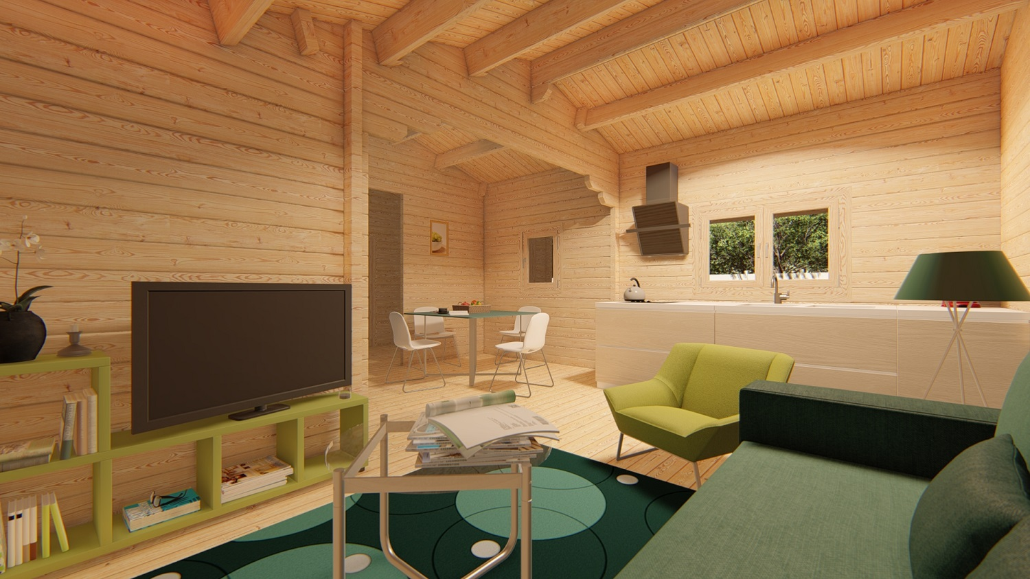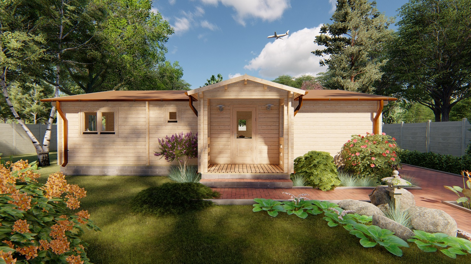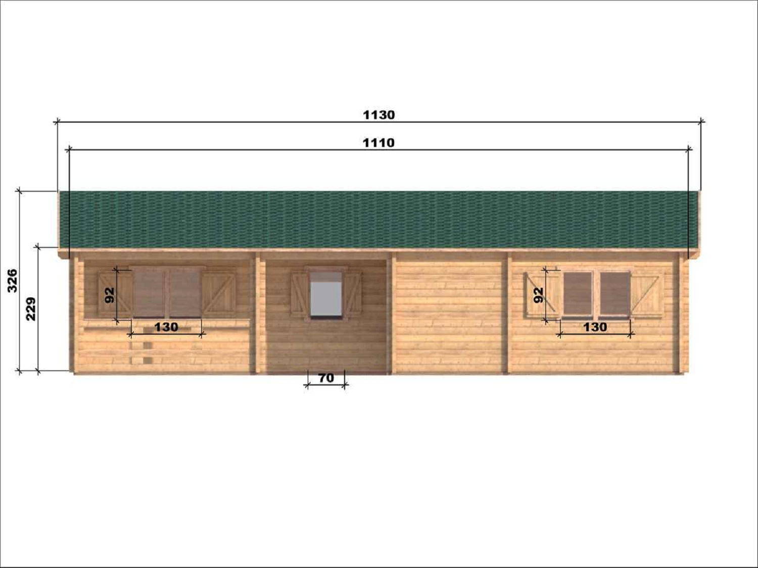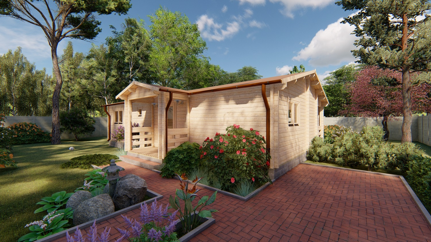 Uma casa de madeira com dois quartos, banheiro e sala/cozinha. Com uma área de 78 m², esta é uma casa de madeira de verdade! É uma casa confortável e espaçosa, com um terraço. Este chalé permitirá que você aproveite o ar fresco enquanto se protege do sol e da chuva. Claro, o chalé Markus também é muito sólido, graças à sua estrutura de madeira de abeto.