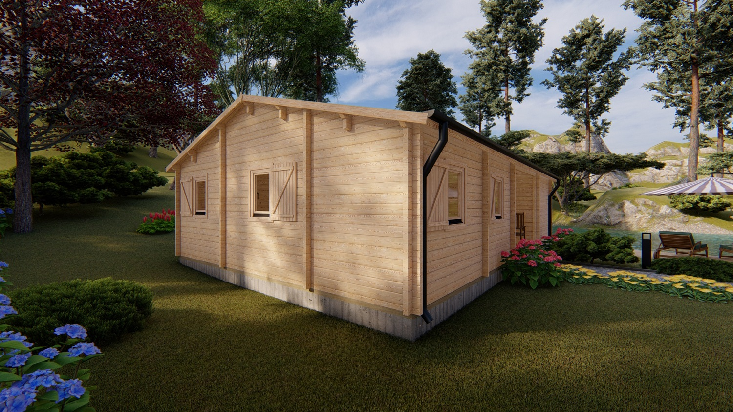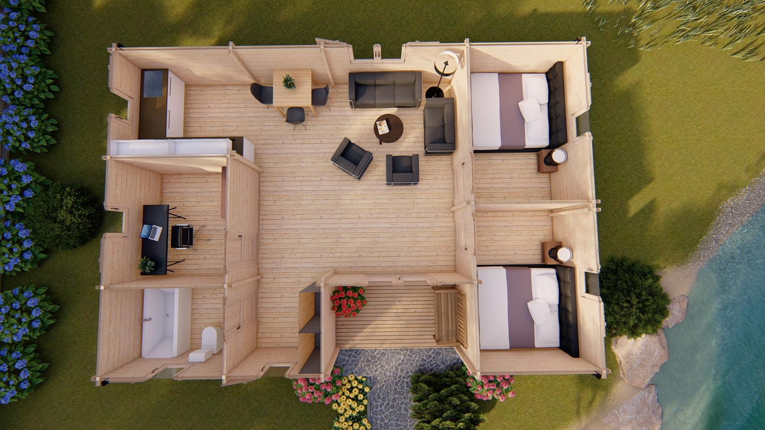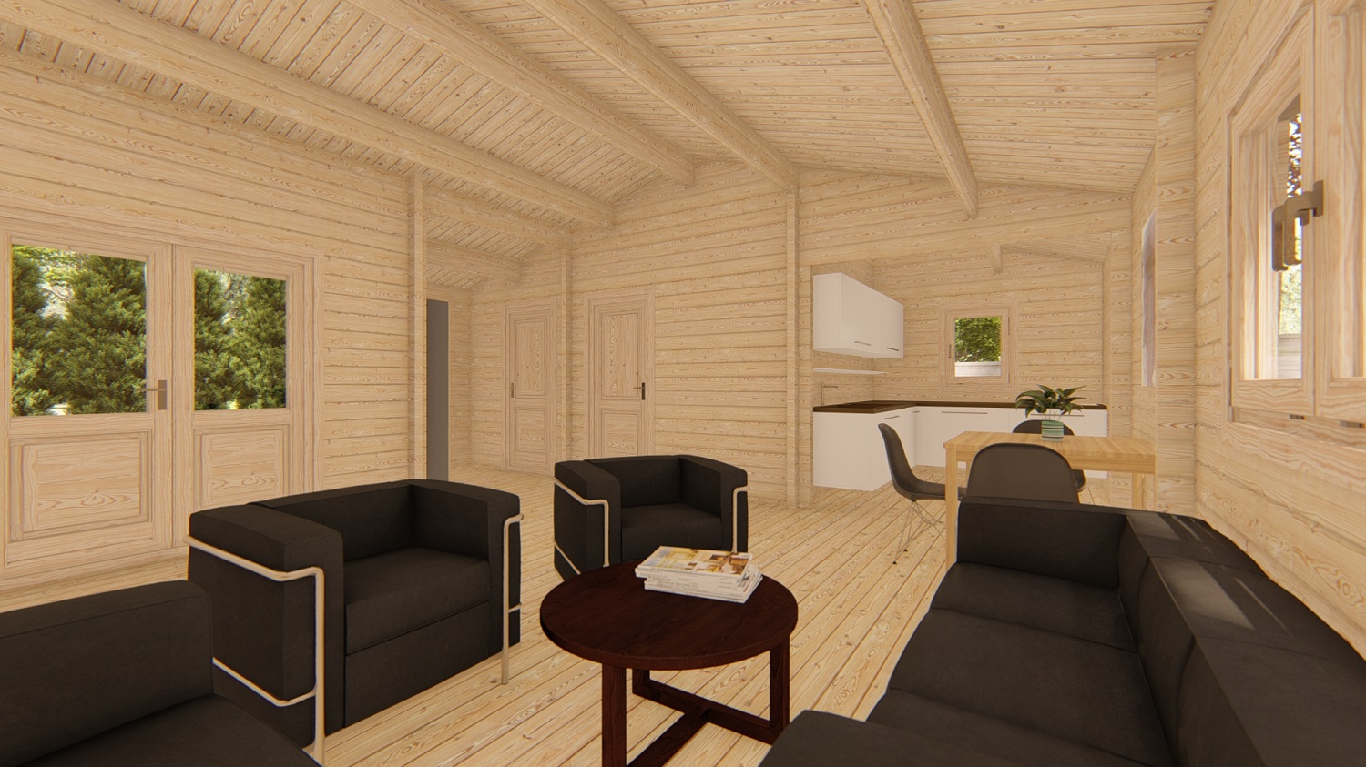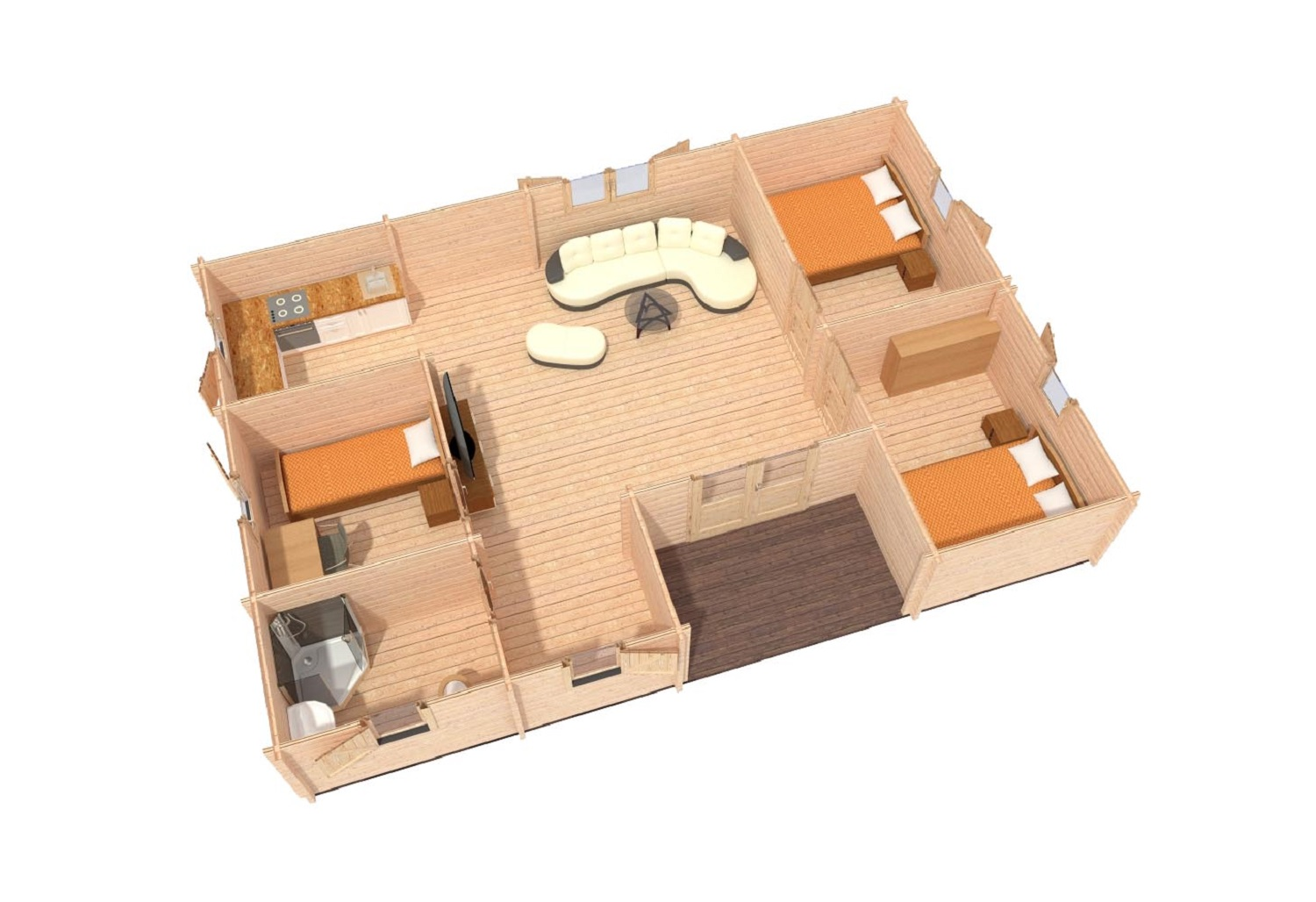 Um bangalô de madeira com superfície de 70m², com 3 quartos, banheiro, sala de estar espaçosa e cozinha. É um bangalô espaçoso e confortável. Claro, o chalé Scarlett também é muito sólido, graças à sua estrutura em madeira de abeto.