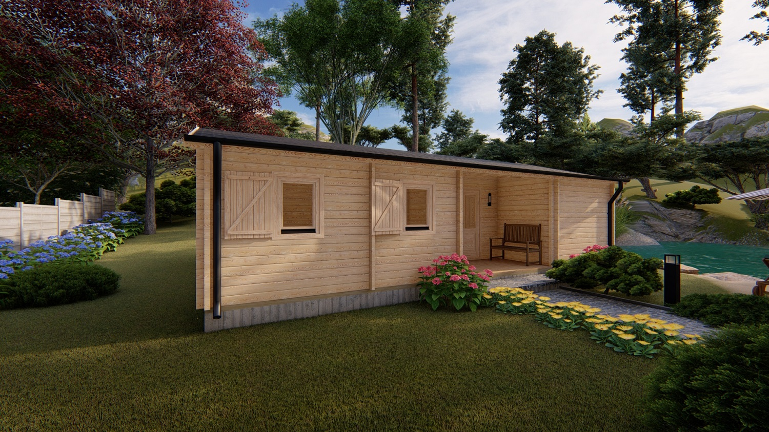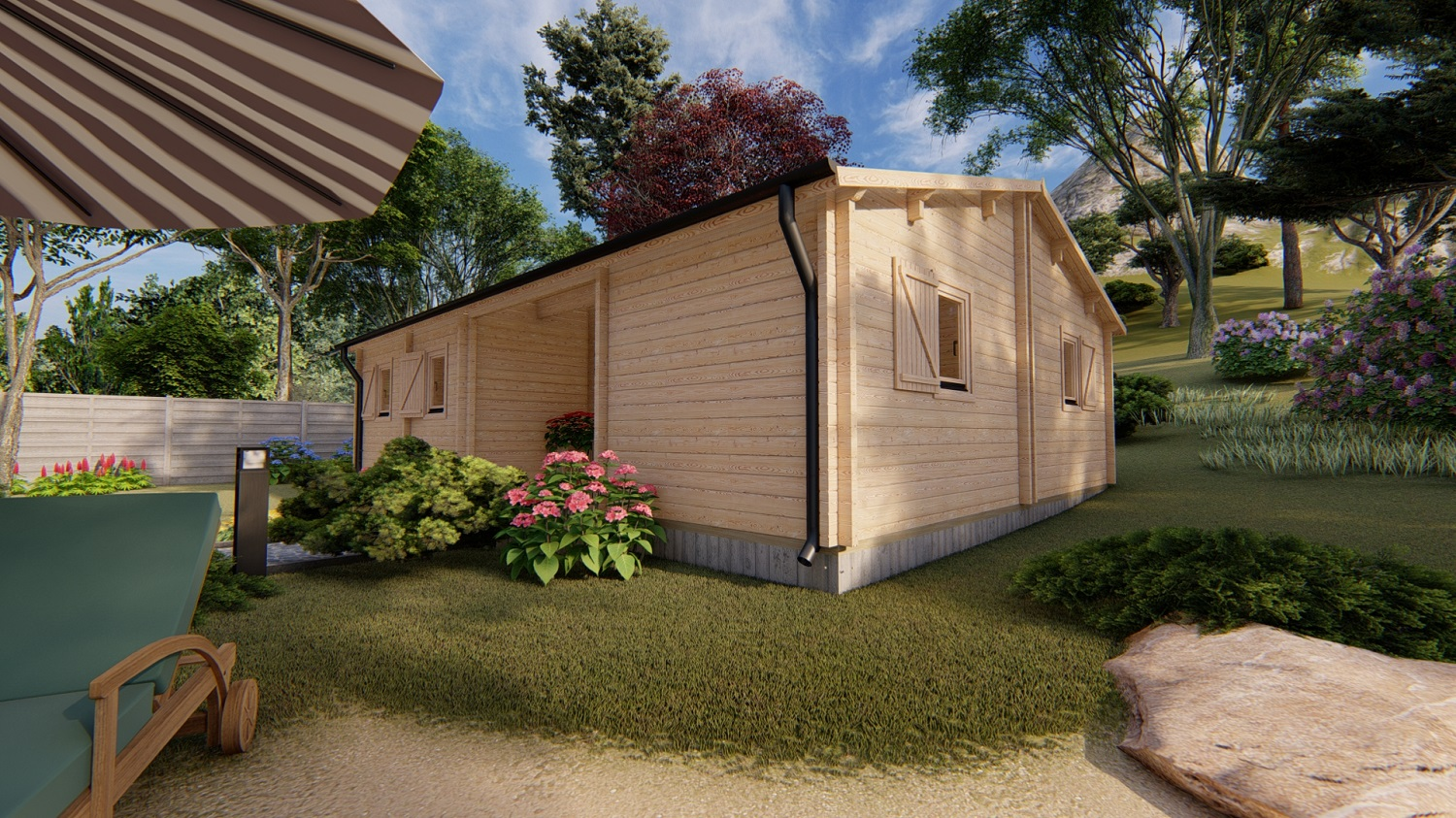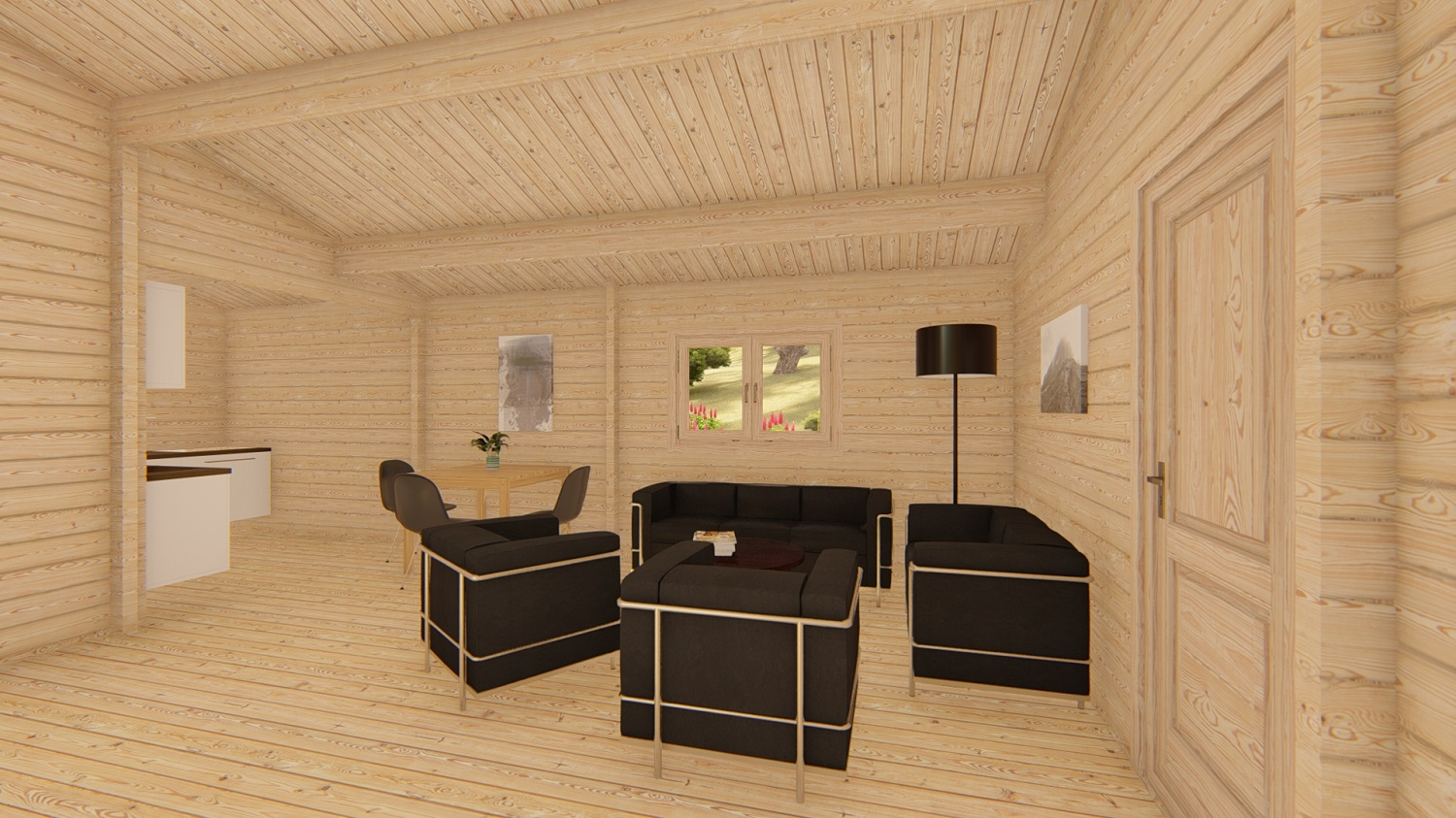Um bangalô de madeira com superfície de 70m², com 3 quartos, banheiro, sala de estar espaçosa e cozinha. É um bangalô espaçoso e confortável. Claro, o chalé Scarlett também é muito sólido, graças à sua estrutura em madeira de abeto.