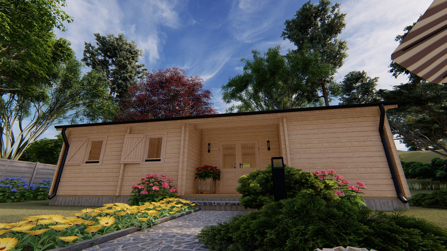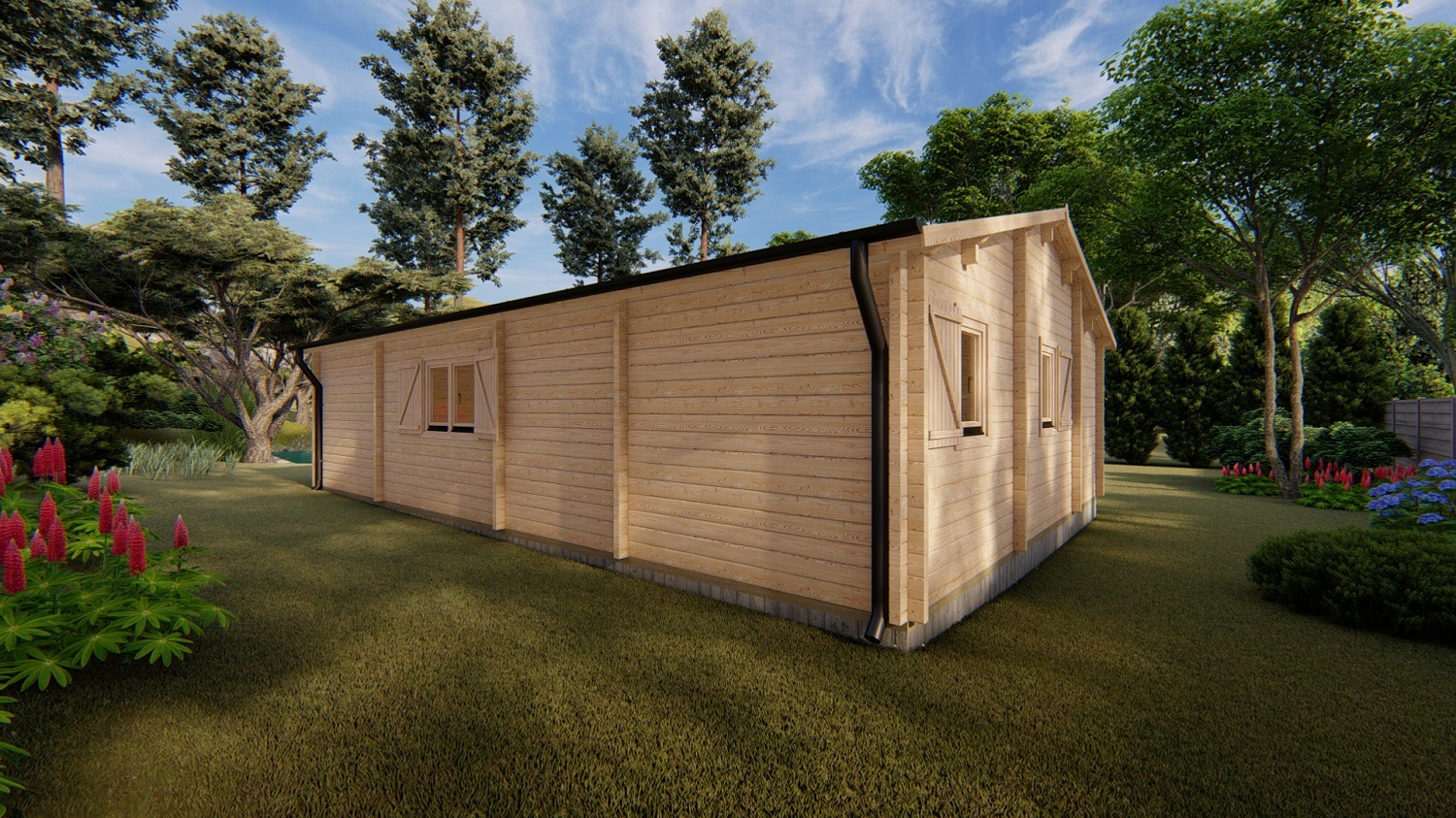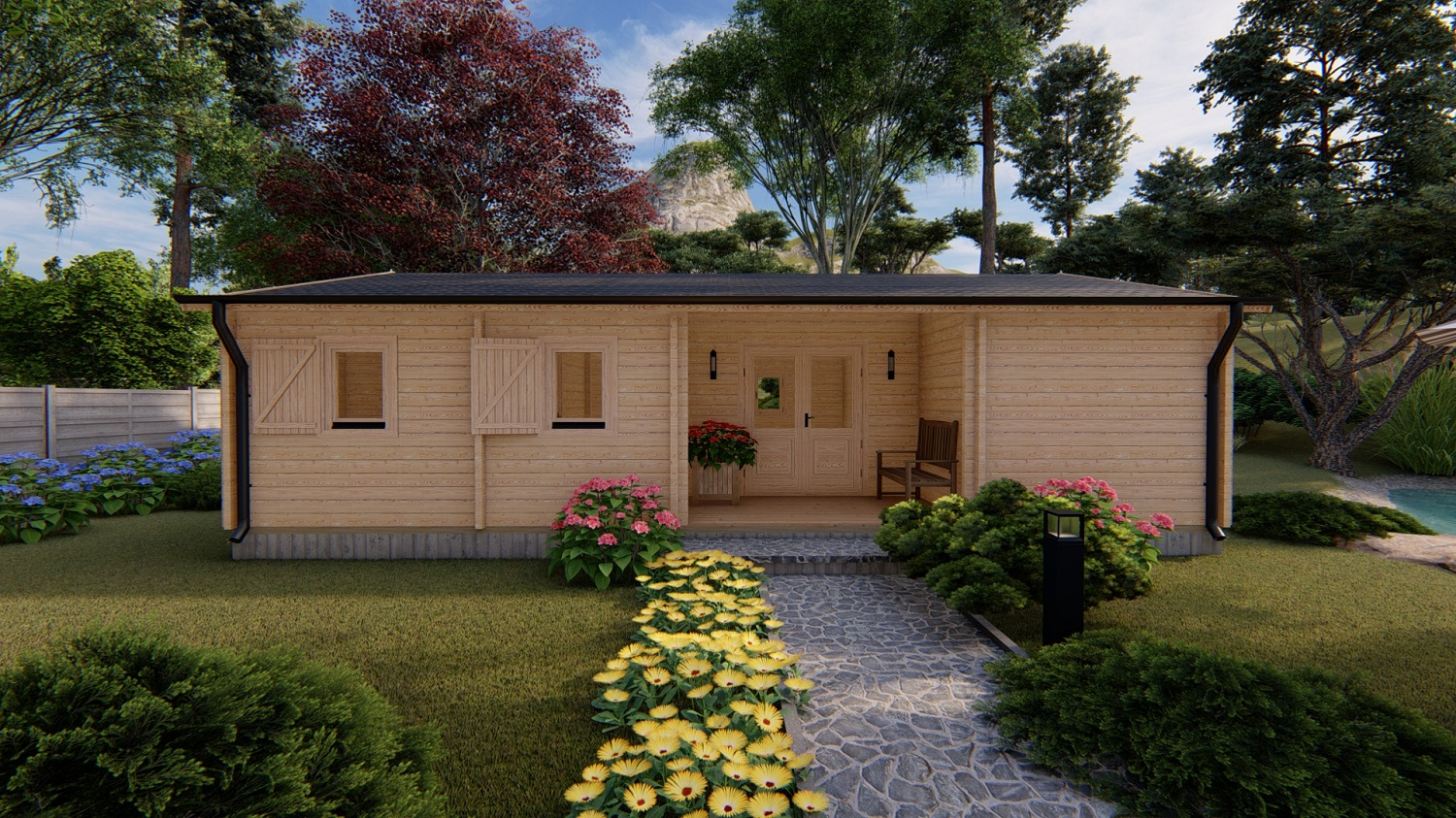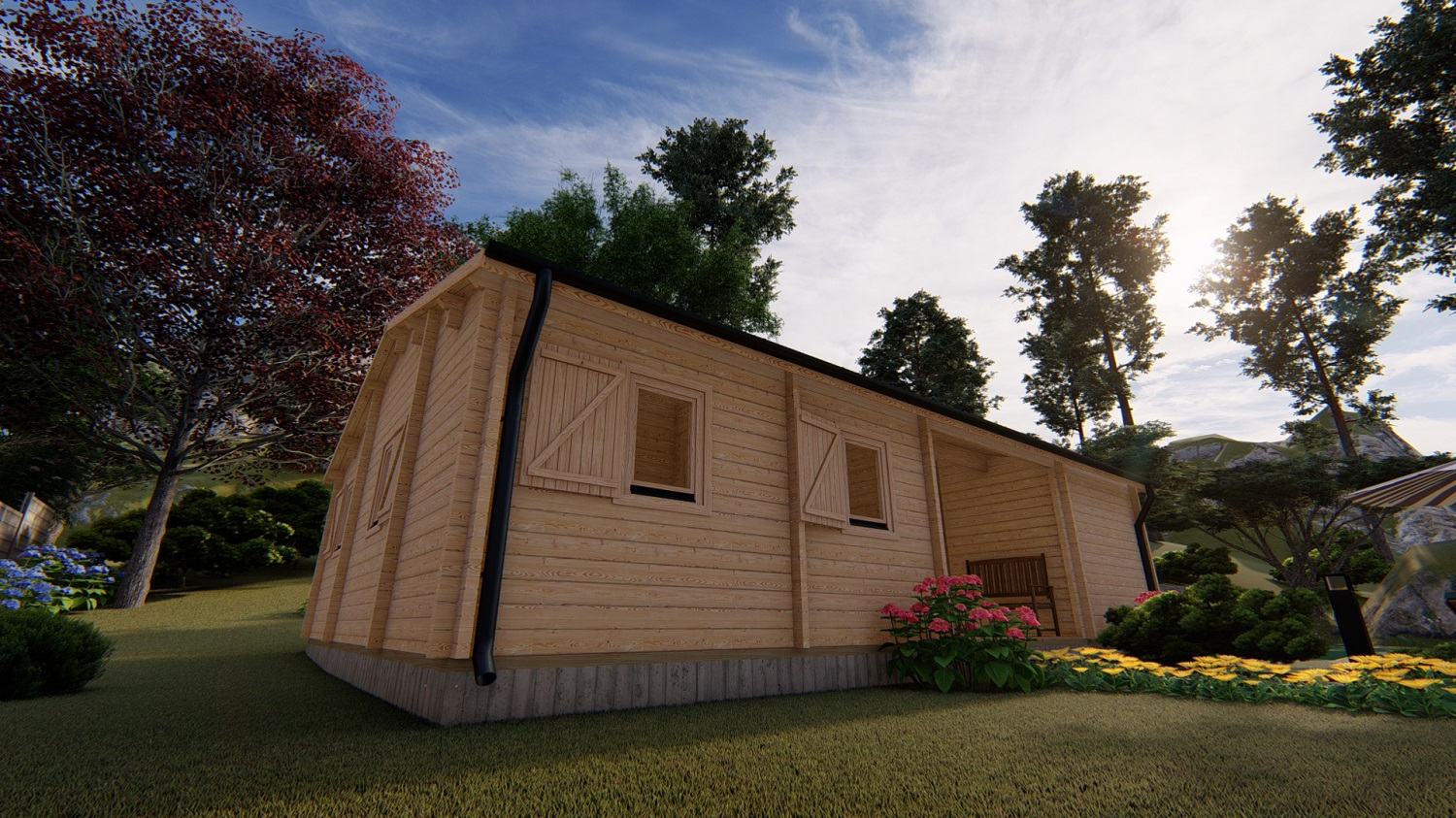Um bangalô de madeira com superfície de 70m², com 3 quartos, banheiro, sala de estar espaçosa e cozinha. É um bangalô espaçoso e confortável. Claro, o chalé Scarlett também é muito sólido, graças à sua estrutura em madeira de abeto.
